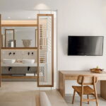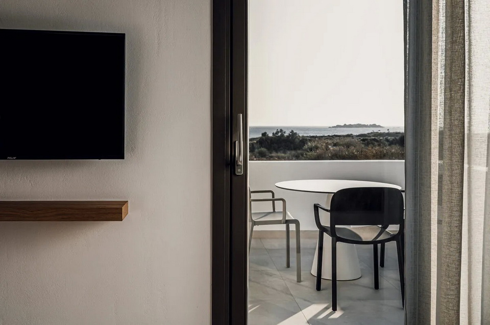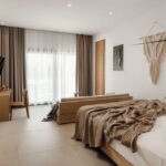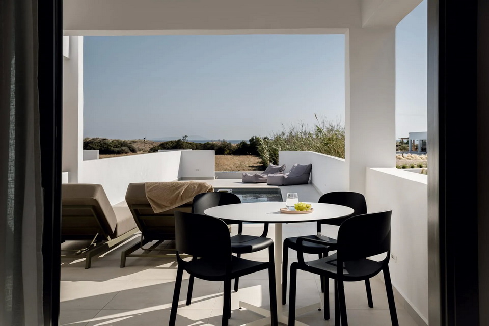 Alle Zimmer sind zurückhaltend gestaltet, mit hochwertigen Materialien, ein bisschen minimalistisch, sehr passend zur Dünenlandschaft rundherum und der glitzernden Ägäis davor.